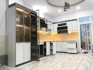 Tủ bếp nhôm hệ cánh kính có giá thành cao hơn so với các loại tủ bếp thông thường do sử dụng kính cường lực cao cấp và thiết kế hiện đại.